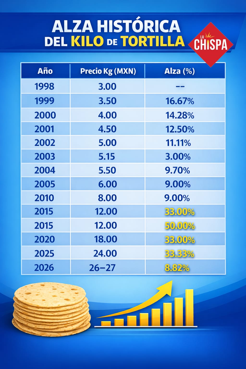 ALZA HISTÓRICA DEL KILOGRAMO DE TORRILLA EN 28 AÑOS