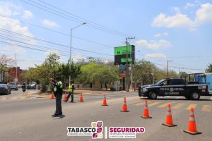 Para mantener vialidades libres de tránsito, agentes de la PEC despejaran los automóviles estacionados sobre la ruta del Desfile de Carros Alegóricos que comprende desde Circuito interior Carlos Pellicer Cámara del tramo de Av. Esperanza Iris y Paseo Tabasco, pasando por Malecón Carlos A. Madrazo Becerra, continúa por Av. Coronel Gregorio Méndez Magaña, Av Mario Brown Peralta para concluir en Circuito Deportiva, además del cierre total de calles aledañas y concurrentes en toda la ruta del desfile.