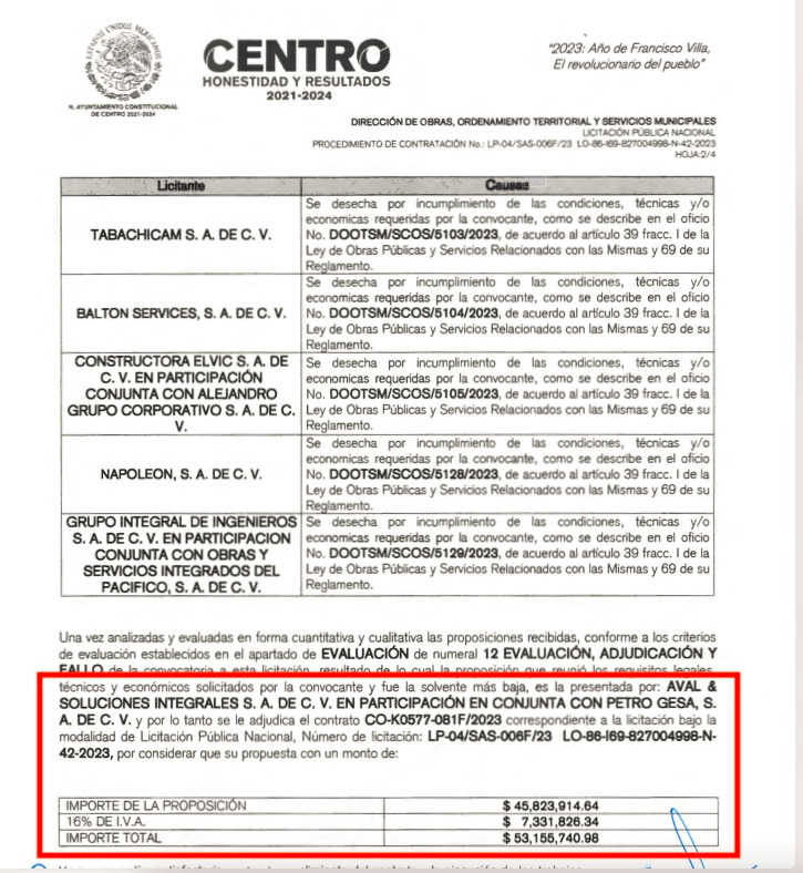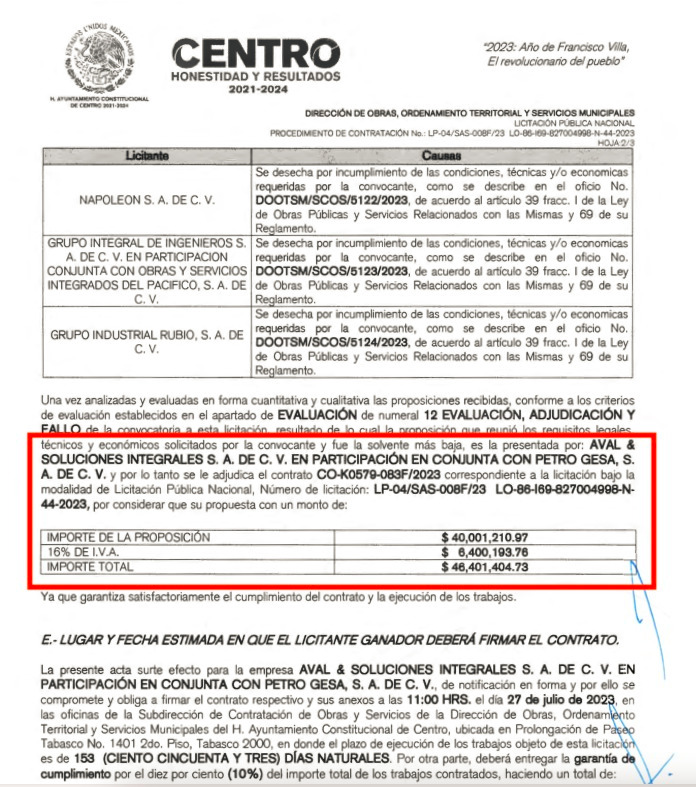 Tras celebrarse el fallo de las cuatros licitación convocadas por el Ayuntamiento de centro, a través del Sistema de Agua y Saneamiento (SAS), que contemplan la construcción de los cuatro tramos en que fue dividida la obra del Acueducto ‘Usumacinta’ para la conducción de agua cruda, el consorcio conformado por Aval & Soluciones Integrales SA de CV, de José Reyes Gómez Martínez y Ricardo Gómez Rodríguez, y PETROGESA SA de CV, del polémico junior y empresario Gerardo Sánchez Zumaya, firmaron los contratos CO-K0579-083F/2023 y CO-K0577-081F/2023 para los tramos 3 y 1 por un monto de $46,401,404.73 y $53,155,740.98 pesos, respectivamente.