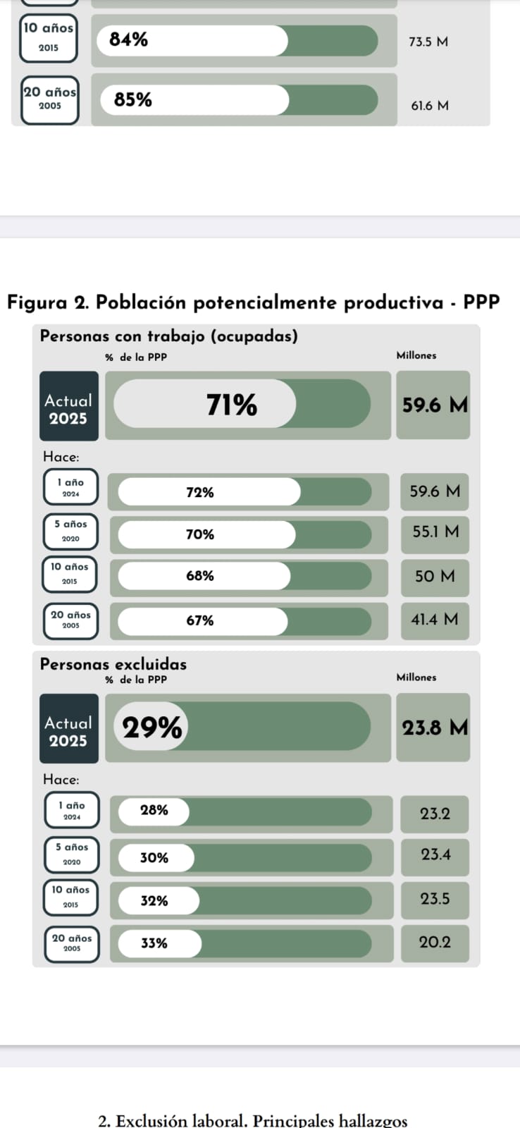 La exclusión total bajó 4 puntos porcentuales (de 33% a 29% de la PPP), pero en términos absolutos pasó de 20.2 a 23.8 millones: hay 3.6 millones excluidas que hace dos décadas.