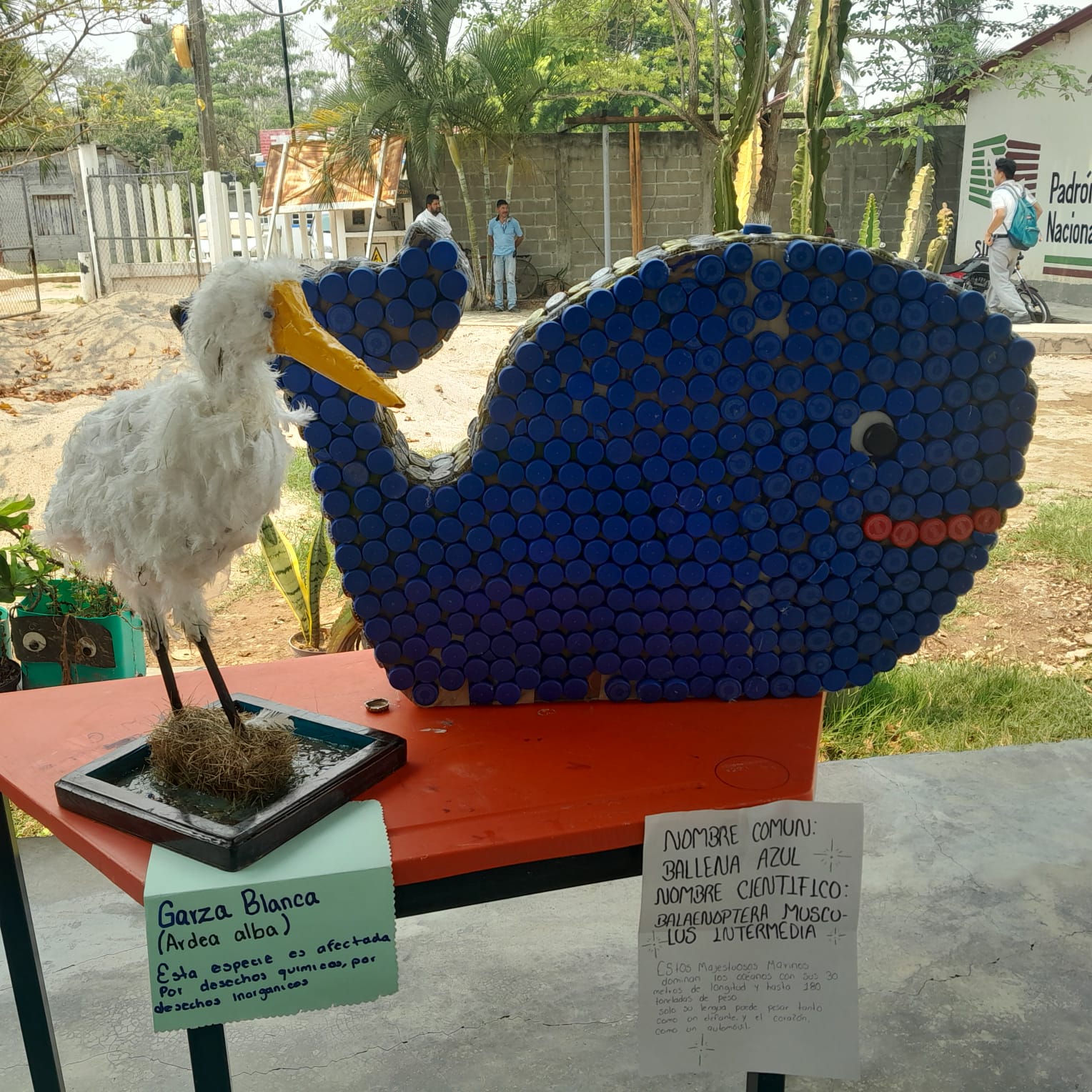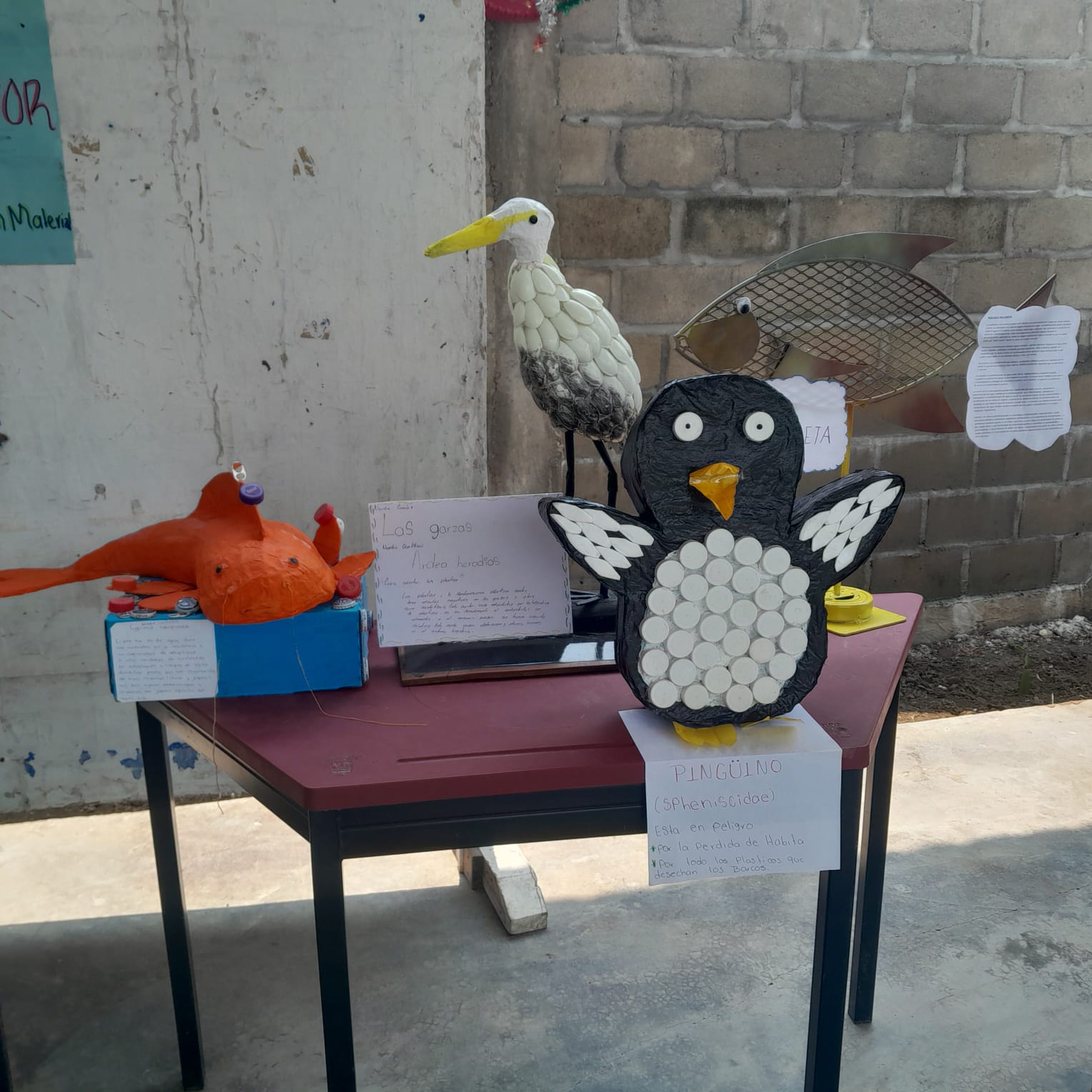Los estudiantes del taller de ciencias de los grupos: 2A, 2B, 2C, del Colegio de Bachilleres de Tabasco (Cobatab) Emsad Plantel 25, organizados en equipos por la profesora Anita de la cruz Gómez, recolectaron los materiales sintéticos reutilizables para la construcción de esculturas de especies animales.