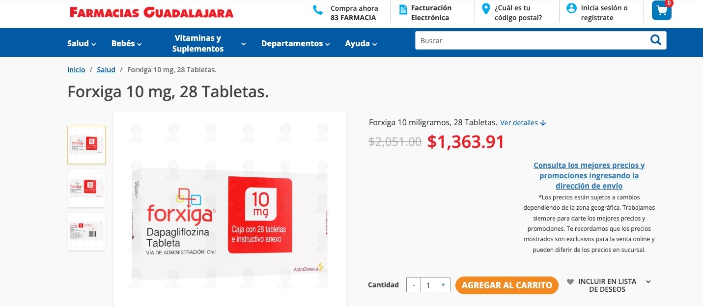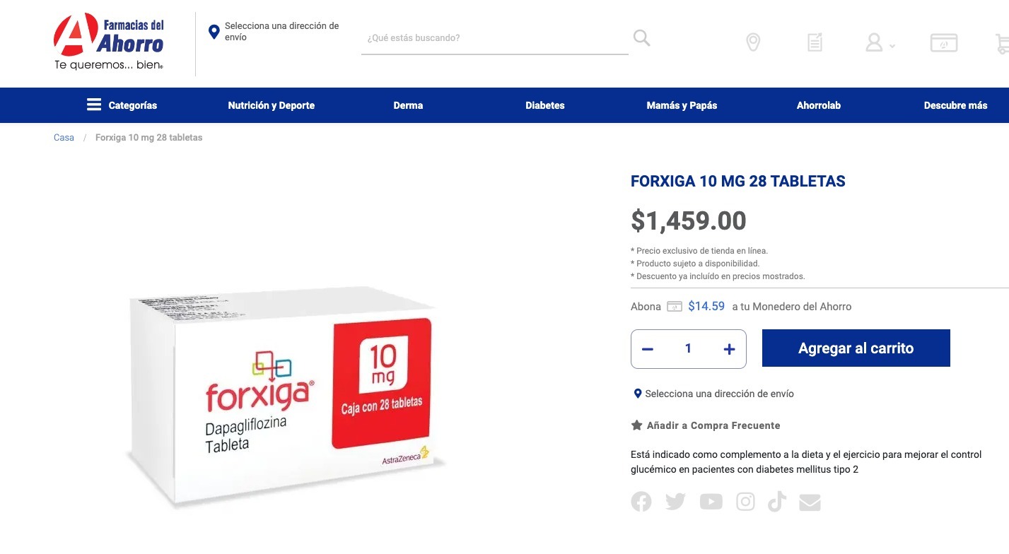 En esta ocasión, de acuerdo con los documentos oficiales del IMSS, el producto comprado es Dapagliflozina Propanodiol, conocido comercialmente con el nombre de FORXIGA, equivalente a 10 mg de dapagliflozina, en su presentación de 28 tabletas, por las que se pagó un precio unitario de $2,049.85 pesos por c/u de las 20,881 piezas adquiridas.