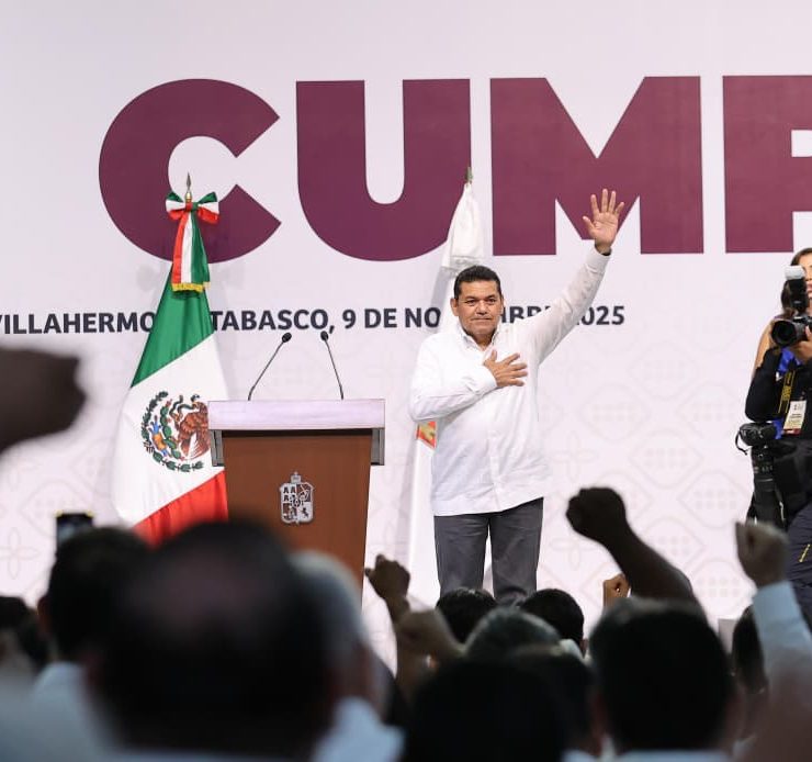 May Rodríguez arribó alas 10:58 al Centro de Convenciones, respondiendo los efusivos saludos y las peticiones de tomarse una foto que le hacían los asistentes en su camino al templete. Después de saludar al enviado especial de la Presidenta, Claudia Sheinbaum, el subsecretario de Industria y Comercio de la Secretaría de Finanzas, Vidal Llerenas Morales; a la jefa de Gobierno de la Ciudad de México, Claudia Brugada Molina y los Gobernadores de Oaxaca, Salomón Jara Cruz, y de Chiapas, Eduardo Ramirez Aguilar, subió por las escaleras hacia el escenario y el grito de “¡Gobernador! ¡Gobernador! ¿Gobernador!”, retumbó a una voz en el convenciones.