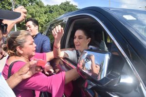 Cuando la caravana llegó, la señora Castillo junto a las otras personas, se acercó a la unidad. Sheinbaum bajó la ventanilla para saludar de mano, tomarse fotos con quienes lo pidieran y recibir las solicitudes. La señora Castillo tenía apenas un “papelito doblado”, que extendió a la Presidenta. El admirador también entregó la cajita, como puede verse en una de aquellas fotos, tomadas por los presentes.