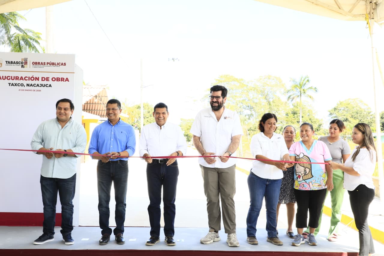 En gira de trabajo el gobernador Javier May Rodríguez hizo entrega de la construcción de pavimento con concreto hidráulico de 459 metros, guarniciones, banquetas, red de agua potable y drenaje sanitario de una importante calle del poblado Taxco en Nacajuca.