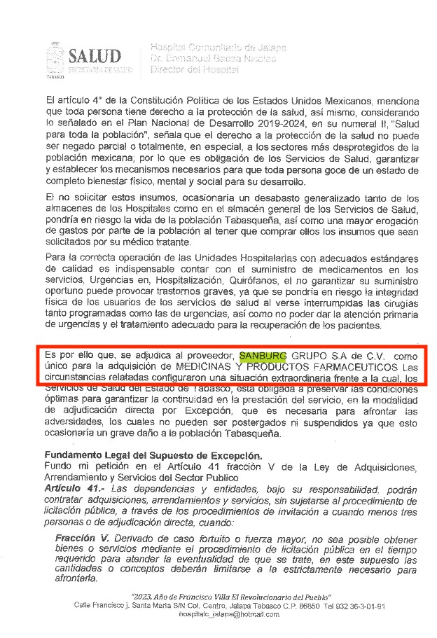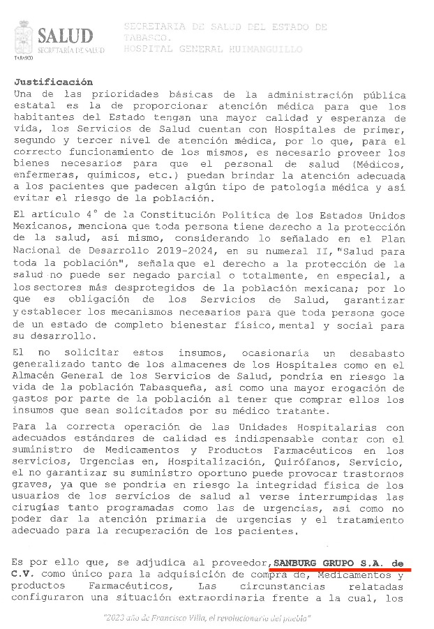 Todo los contratos entregados fueron sin licitar, es decir, mediante la adjudicación directa por tratarse de una situación extraordinaria por lo que el Sector Salud eximió las licitaciones y poder afrontar las adversidades, los cuales no pueden ser postergados ni suspendidos ya que esto ocasionaría un grave daño a la población tabasqueña: por ejemplo están los contratos CV08440101-598/2023 y CV08130101-602/2023, por un monto de $599,988.67 y $1,158,432.59 pesos, respectivamente, para la adquisición de medicinas y productos farmacéuticos como Benzatina, bencilpenicilina equivalente a 1,200,000 UI de bencilpenicilina; Cefalotina. Solución inyectable; Complejo B. tableta comprimido o capsula; Dicloxacilina, solución inyectable; o Heparina, solución inyectable.