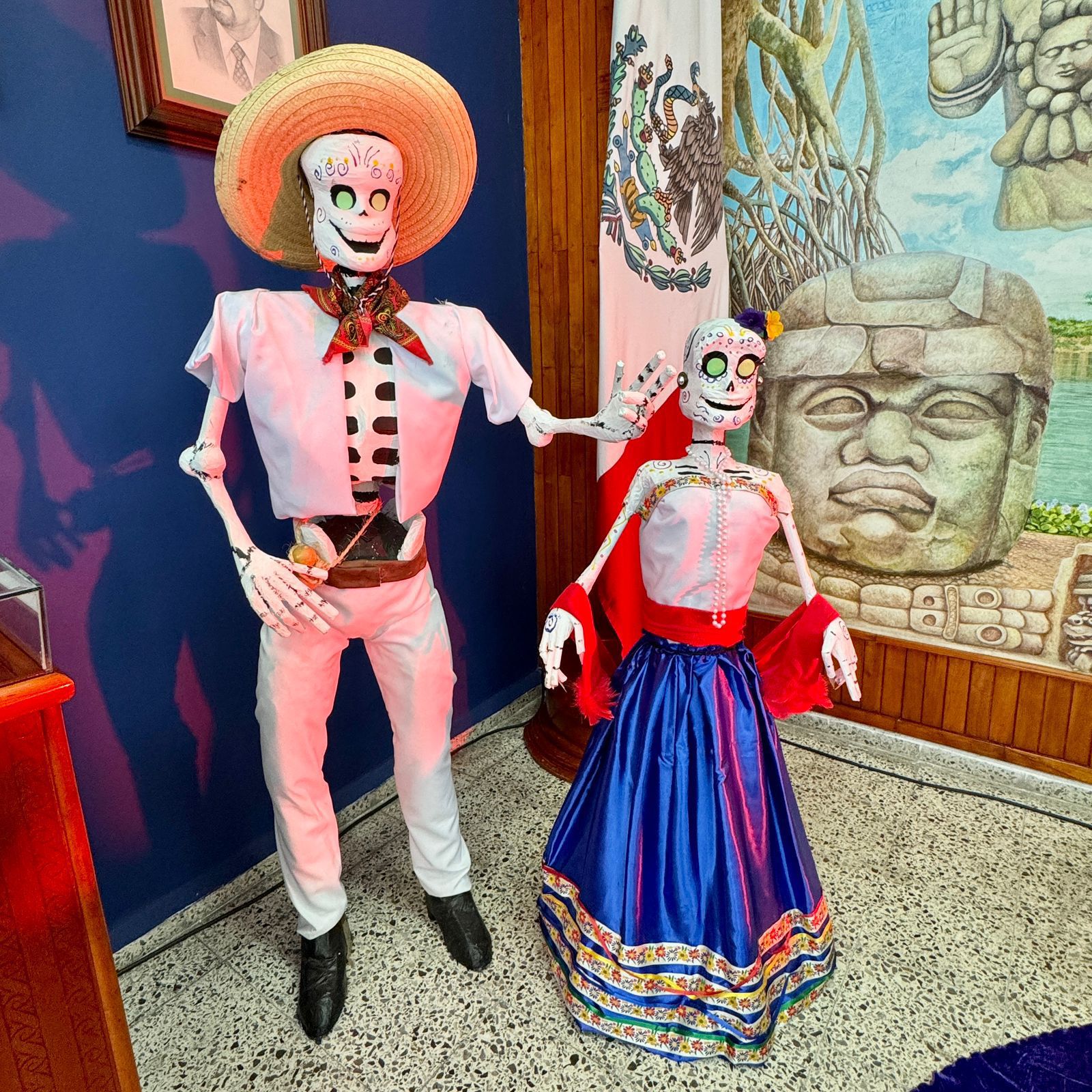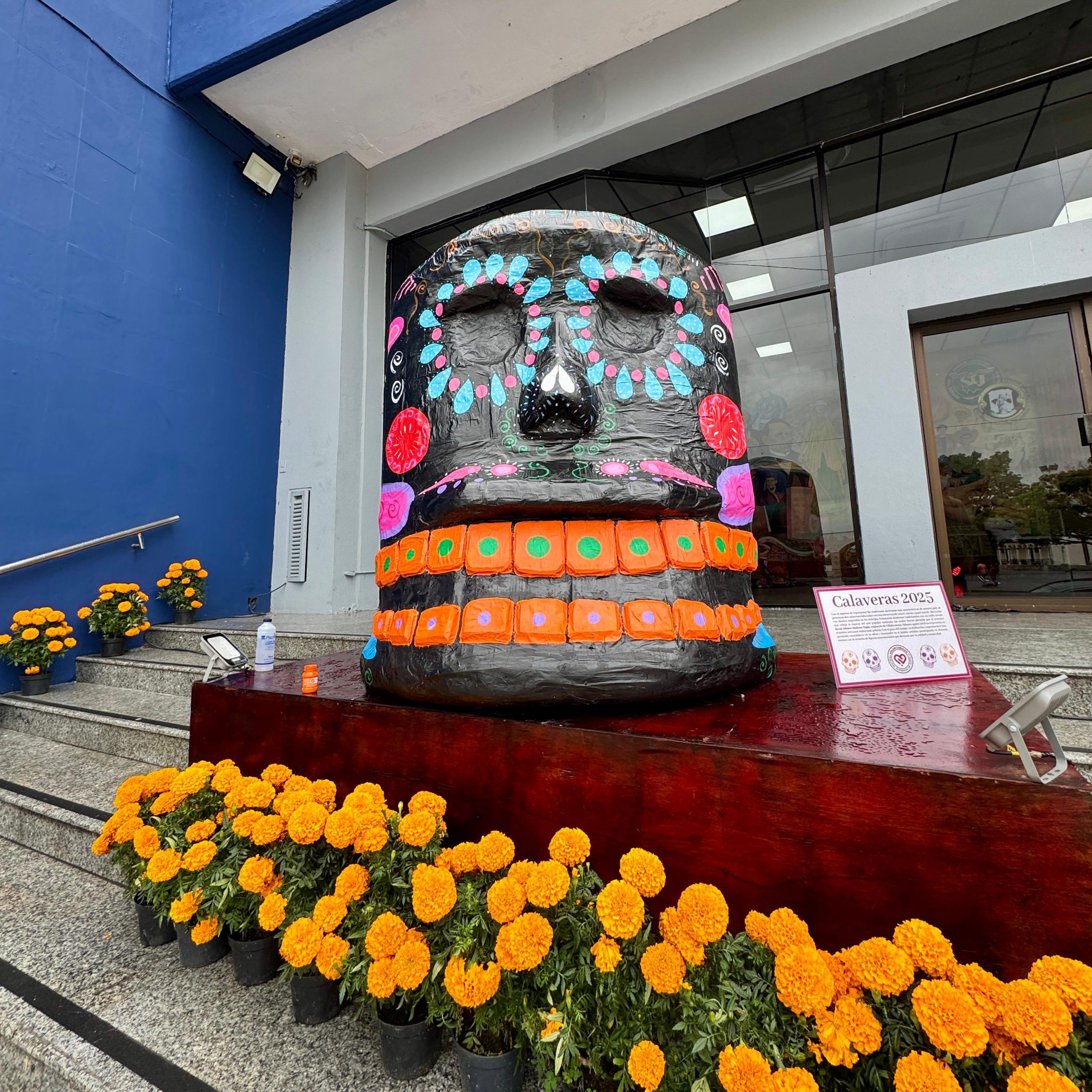 Finalmente, los asistentes a la ceremonia se tomaron una foto grupal en las escalinatas del edificio sede, donde dos grandes calaveras elaboradas en papel maché adornan la entrada. Éstas fueron elaboradas por el artesano tabasqueño David Alfonso Madrazo Tapia, quien con su creatividad nos recuerda que el arte popular es una forma de mantener viva la tradición.